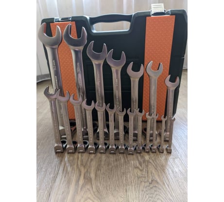Хороший пластиковый кейс с металлическими замками и петлями, широкий типоразмер ключей, маркировка с размером нанесена чётко и со всех сторон, присутствует стрелка указания поворота трещётки (с обеих сторон)