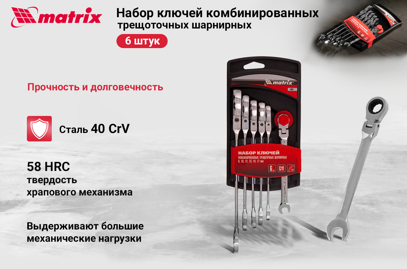 Набор комбинированных трещоточных шарнирных ключей MATRIX 6шт 14897