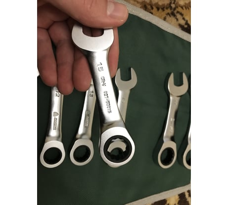 Набор комбинированных трещоточных укороченных ключей 10-19мм, 7шт МАСТАК 0215-07H имеют специальную конструкцию - рожковые головки изогнуты под углом 150. За счет таких качеств инструменты очень удобны для проведения крепежных работ в местах с ограниченным доступом. 12-тигранный профиль накидных головок позволяет работать с болтами или гайками как 6-ти, так и 12-тигранного профиля. Для удобства хранения и транспортировки в порядке и с минимальным риском утери компонентов в комплекте предусмотрен пластиковый держатель.