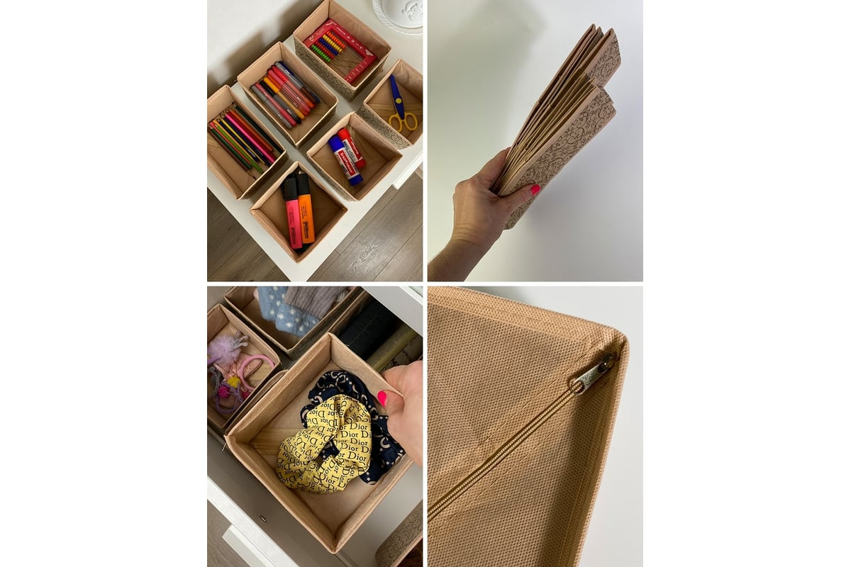 Жесткие стенки отлично держат форму. Размеры коробок хорошо сочетаются между собой. Изделия легко складываются с помощью молнии на дне.