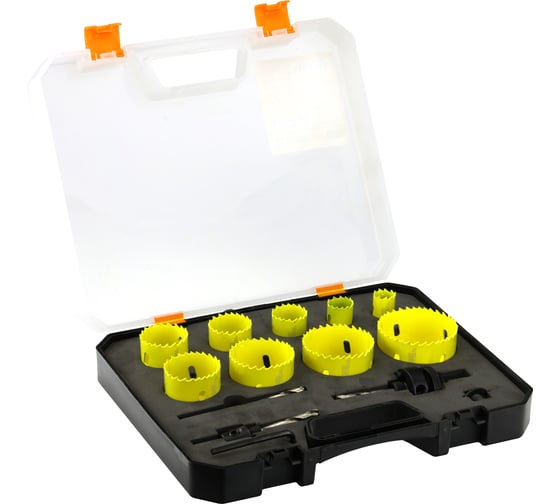 - коронки биметаллические: 19 мм, 22 мм, 29 мм, 35 мм, 38 мм, 44 мм, 51 мм, 57 мм, 64 мм - по 1 шт.
