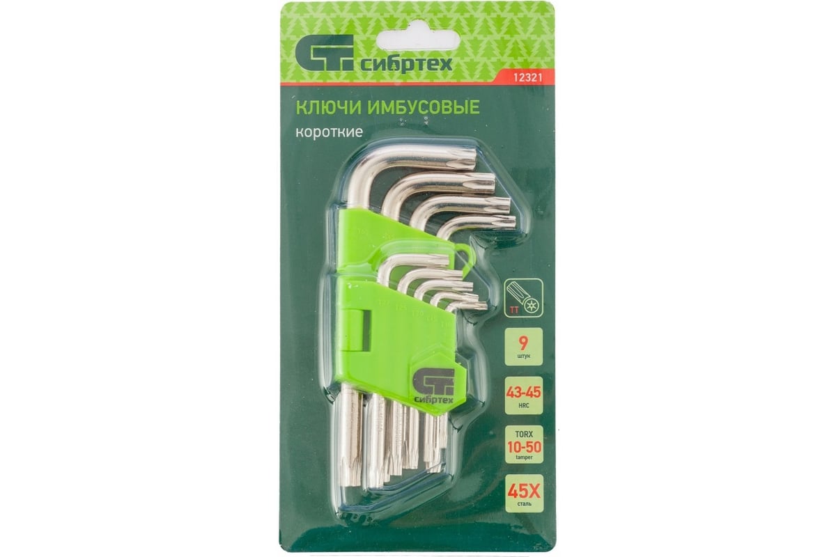 Набор коротких имбусовых ключей Сибртех 12321, TT10-TT50, из закаленной стали 45Х, включает в себя 9 ключей для работы со специализированными крепежами, оснащенными шлицами Tamper-Torx в виде звездочки со штырьком в центре. Ключи размером от TT10 до TT50 используются для разборки и сборки оборудования, защищенного от несанкционированного вмешательства пользователя, - например, аккумуляторных отсеков электроинструмента или бытовой техники.