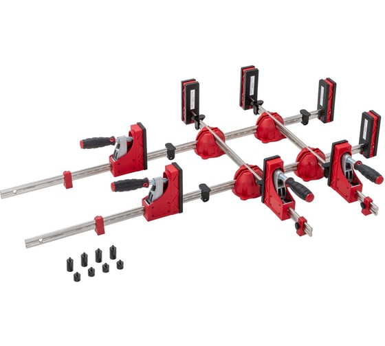 JET JC-12 набор корпусных струбцин с необходимыми для удобной работы принадлежностями, предназначен для сборки на клею конструкций из дерева. Включает в себя четыре корпусных струбцины , 2 шт по 1015 мм и 2 шт по 615 мм и большой набор вспомогательных приспособлений, а именно : крестовые блоки-стойки («крест на крест») для удерживания четырех струбцин одновременно под строго фиксированным углом в 90 градусов и набор из 8ми стальных цилиндров фиксации струбцин в стол. Их необходимо установить в струбцины и/или в крестовые стойки для их фиксации на рабочей поверхности с круглыми монтажными отверстиями стандартного размера 19мм.