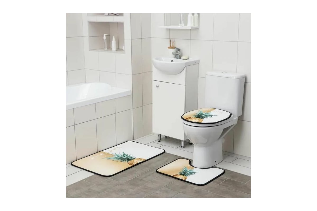 Набор ковриков для ванны и туалета Доляна Ананас 50х80, 45х50, 38х43 см 3 шт. 6073525 используется для покрытия пола туалета и ванной комнаты.
