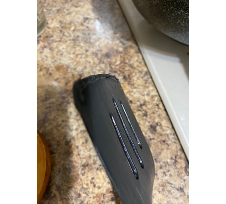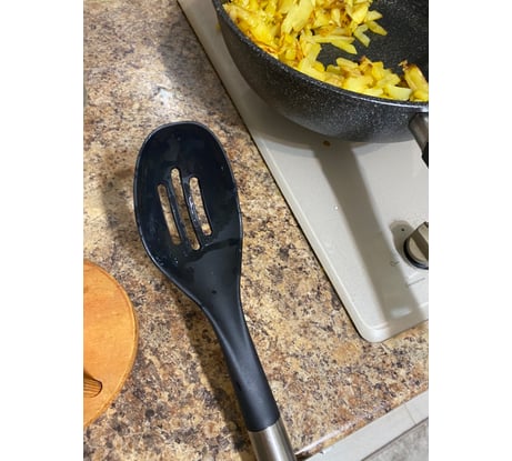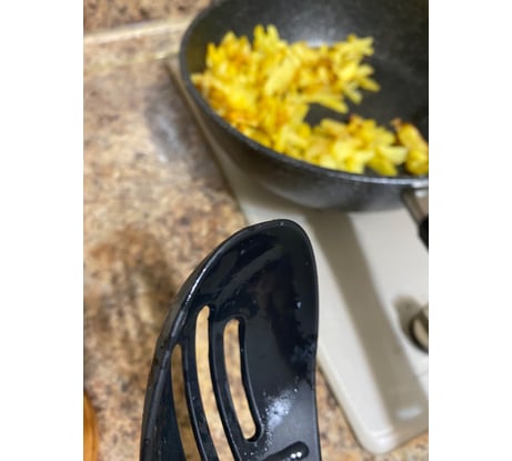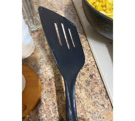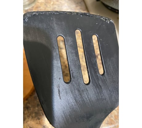 Окончание рабочей поверхности широкой лопатки при перемешивании жаренной картошки подплавилось. Выбросил деньги на ветер. Для здоровья опасно. Такое и продавать опасно.