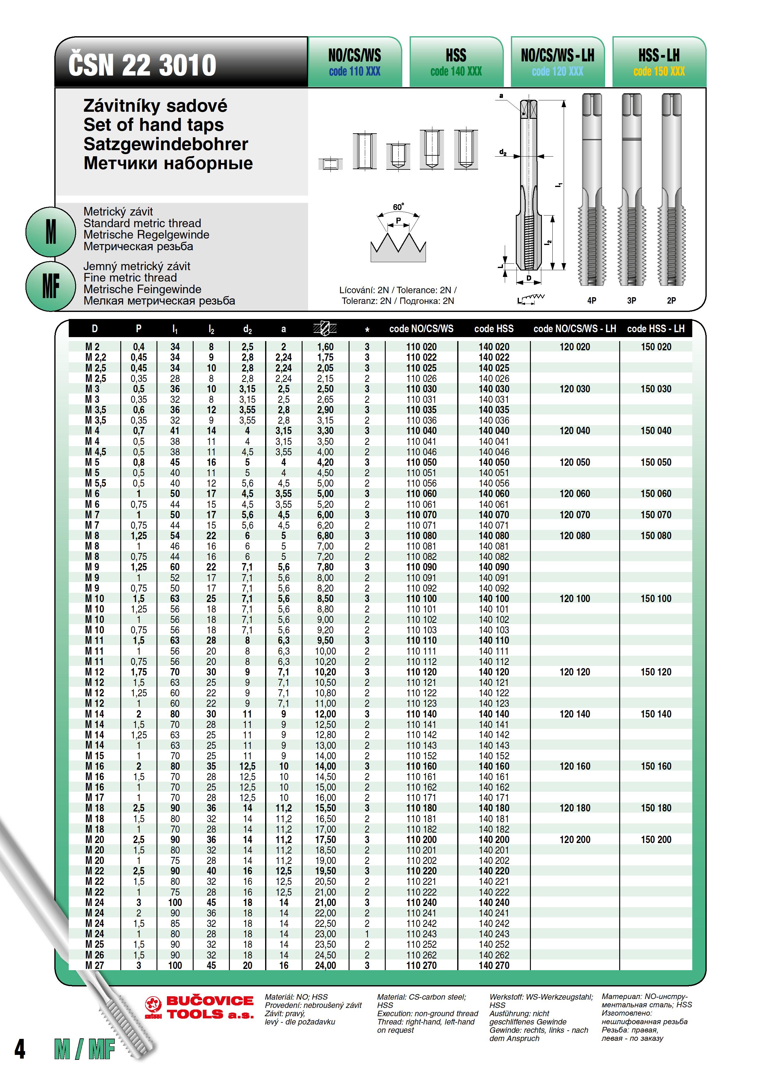 Технические характеристики набора левых метчиков Bucovice Tools 120140