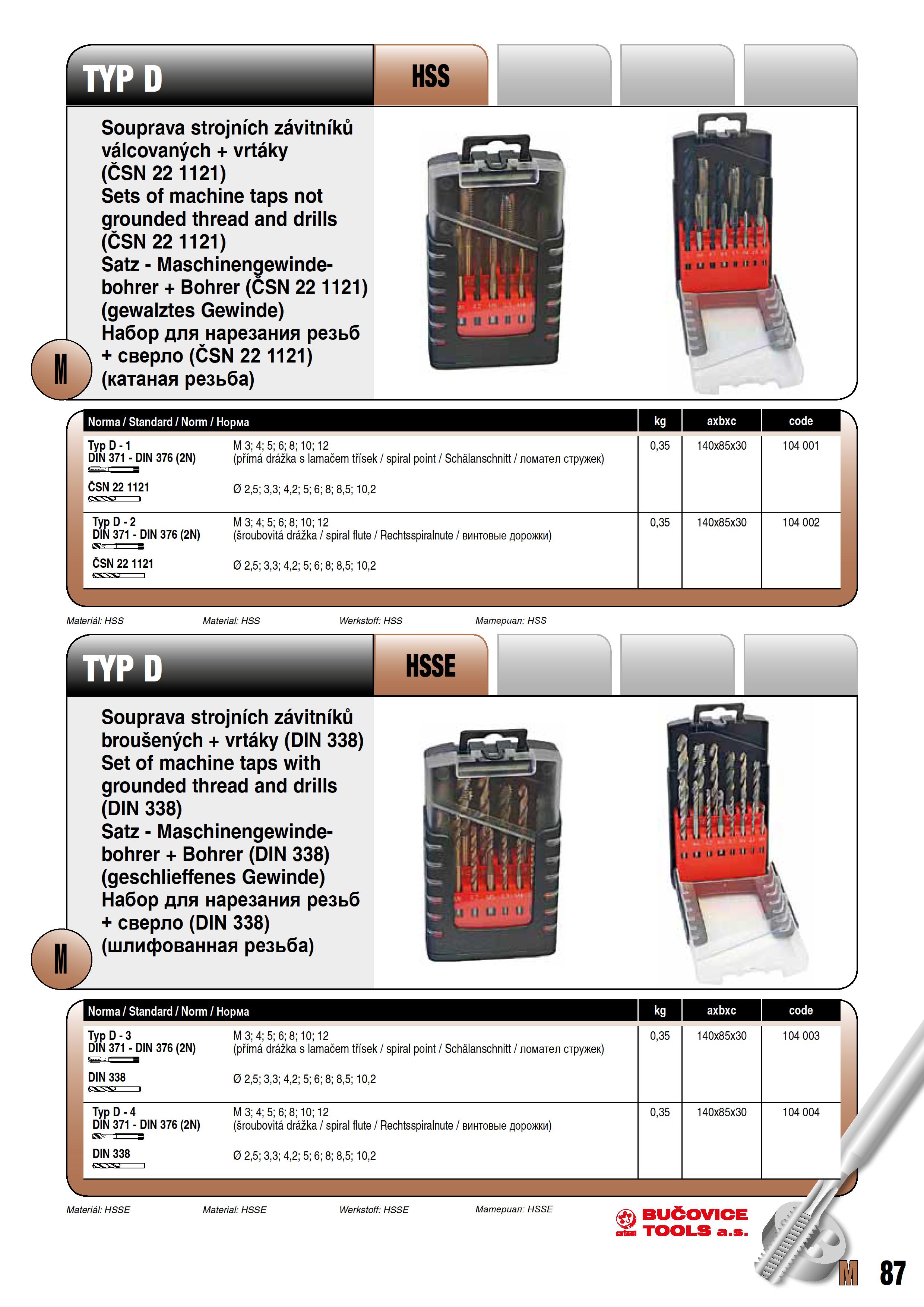 Набор включает машинные метчики, для метрической резьбы с основным шагом, изготовленные в соответствии с DIN371/376, ISO2(6h). Также в комплект входят сверла под резьбу, изготовленные в соответствии с DIN338, h8..