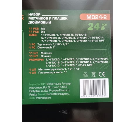Разнообразие размеров: Включает метчики и плашки различных размеров (1/4NC20; 1/4NF28; 5/16NC18; 5/16NF24; 3/8NC16; 3/8NF24; 7/16NC14; 7/16NF20; 1/2NC13; 1/2NF20; 1/8NPT27) для работы с различными типами резьбы.