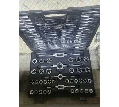 Полный набор для нарезки резьбы! Есть все размеры метчиков и плашек. Сталь качественная — не ломается и не тупится быстро. Удобный кейс, ничего не теряется. В гараже уже не раз выручал. Цена радует. Рекомендую!