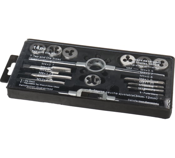 - 7 плашек: 3×0.5; 4×0.7; 5×0.8; 6×1.0; 8×1.25; 10×1.5; 12×1.75