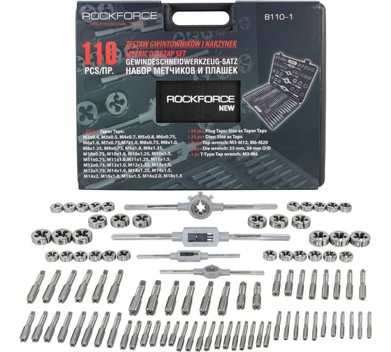 Набор метчиков и плашек Rockforce 110 предметов(2х0.4,3х0.5,4х0.7,5х0.8,6х0.75-1,8х0.75-1,25,9х0.75-1.25,10х0.75-1.5,11х0.75/1/1.25/1.5, 12х0.75-1.75,14х1-2,16х1-2,18х1.5) RF-B110-1 NEW(50165)