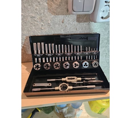 Дюймовый набор покупался как дополнение к метрическому, на всякий случай, но даже пригодился пару раз. Метчики и плашки более-менее неплохие, чтобы прогнать резьбу сгодятся. В чём-то не очень твёрдом, вроде цветнины, как и заявлено, даже получится новую резьбу нарезать. По чермету тоже должны работать. В нержавейке нарезать резьбу не получилось. С чем-то калёным, можно даже не пытаться использовать. Держатели для метчиков и плашек, как и во всех дешёвых наборах, бестолковые, но не разваливаются в руках, хотя бы. Кейс для хранения годный, металлический.