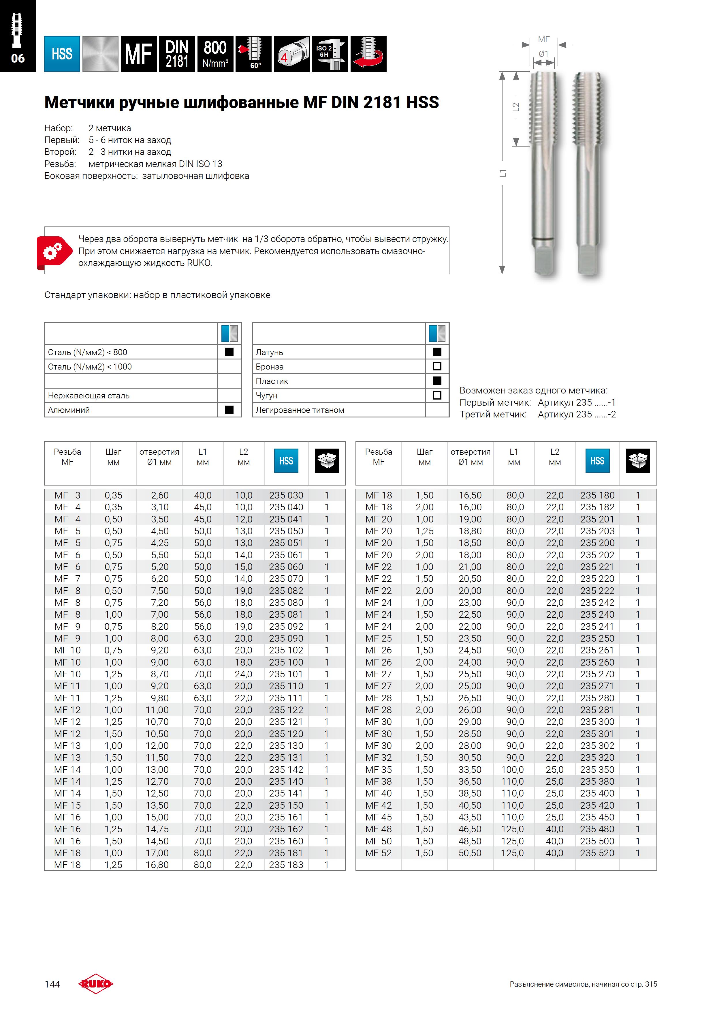 Формирование резьбы происходит в 2 этапа, сначала черновым метчиком (№1), затем финишным (№3). Благодаря этому, снижается усилие, прилагаемое к каждому метчику, а получаемая резьба более точная и чистая. Подходит для обработки заготовок, выполненных из легированной стали, чугуна, алюминия, меди, бронзы, цинка, с пределом прочности до 800MPa.
