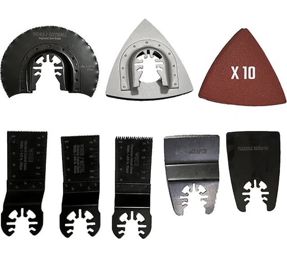 В состав набора входят 10 наждачных листов размером 80 мм, 1 шлифовальная пластина 80 мм, 1 жесткий скребок 50 мм, 1 изогнутый скребок 50 мм, 2 фрезерованных пильных полотна HCS размером 34x40 мм с 18 и 14 зубьями, 1 биметаллическое пильное полотно размером 34x40 мм с 18 зубьями и 1 полупиловое полотно HCS размером 87 мм.