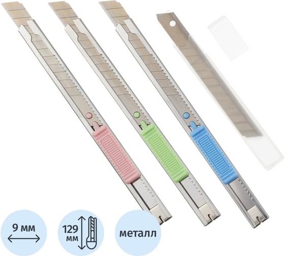 - Нож универсальный 9 мм металлический с выдвижным сегментированным лезвием (3 штуки)