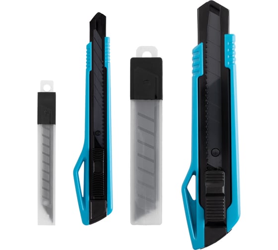 Универсальный набор ножей как 18 мм, так и 9 мм вместе со сменными лезвиями - отличный набор для дома и мелких работ. Эргономичная форма рукоятки, автоматический стопор, сменные лезвия в наборе совместно с ножами - выгодное предложение!