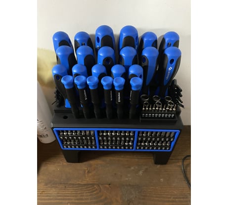 Все требующиеся отвертки и биты в комплекте, подойдет и для гаража, и для дома. Удобные рукоятки, в целом даже удивлен, обычно, с иными отвертками, приходится мириться с некоторым дискомфортом при использовании (но тут конечно все зависит от анатомии руки). Не могу не отметить стойку, для всего этого комплекта, отвертки вставляются с усилием (для кого то минус, для меня же наоборот), кейсы с битами сидят плотно, ничего не дребезжит, в то же время любую биту можно спокойно достать. Сама стойка достаточно увесиста, в виду чего уверенно стоит на верстаке, ее не трясет и не шатает.