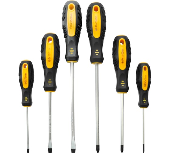 Отвертки крестовые и прямые с эргономичными рукоятками из 6 предметов предназначен для монтажных и демонтажных работ с различными резьбовыми соединениями. Набор строительных отверток из хром-ванадиевой стали подойдёт для решения всех задач по откручиванию и закручиванию шурупов.