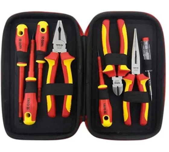 Набор инструментов YATO YT-39631 предназначен для безопасной работы с электрическими системами под напряжением до 1000 В, соответствуя стандарту DIN 5745.