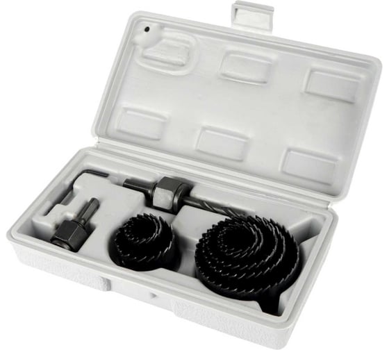 - Набор пил кольцевых - 8 шт, державка - 1 шт, проставка - 1 шт, ключ - 1 шт, пластиковый кейс - 1 шт.