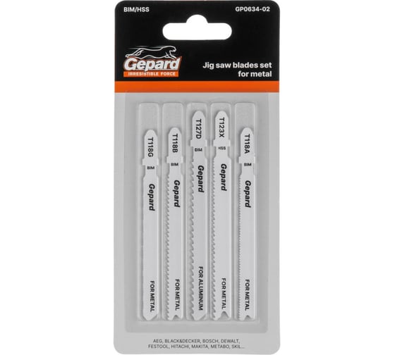 Пилка для электролобзика GEPARD по металлу набор 5 штук (GP0634-02) - набор пилок по металлу используется для обработки листового металла, труб, в том числе алюминиевых, и эпоксидных материалов. Пилки изготовлены из высококачественного биметалла/быстрорежущей стали и имеют универсальный Т-образный хвостовик. Для прямого пропила, быстрого и чистого реза. Являются сменными пильными элементами для электролобзиков.