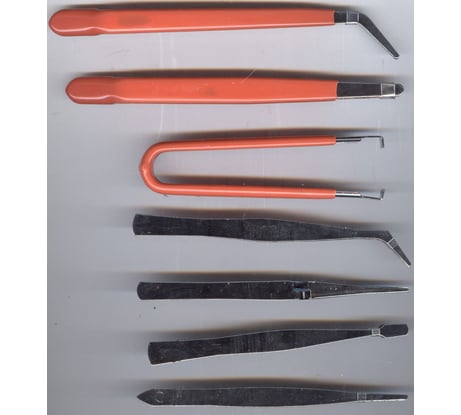 Достоинства: Набор из 3 пинцетов с диэлектрическим покрытием и 4 обычных. Все разного типа. За указанную цену, неплохой выбор. Все пинцеты, кроме с Г-образными губками, с фиксаторами открытия. Все пинцеты из набора, сильно притягиваются магнитом. Диэлектрическое покрытие плотное, самопроизвольно с пинцетов не сползает.