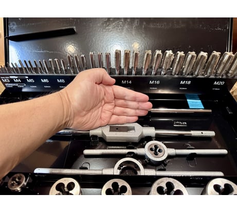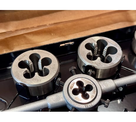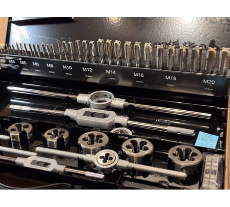 Если стоит задача выбрать топчик, то и выбирать особо не с чего. Остановился на VOELKEL V49251. О самой фирме отзывы как-то противоречивы, но они такие по не дорогим наборам. Данный набор и в количестве достаточный и в характеристиках очень - сталь HSSE с прочностностным пределом до 1200MPa. Цены в более чем 140тр набор не стоит. А вот по скидке за 59тр вполне. На родном сайте в Германии этот набор стоит 772€, что если перевести в рубли вполне выгодная покупка. Сам набор вполне избыточный для домашнего использования. Осмотрел все метчики и плашки, все идеально. Все подписано, маркировано и везде надпись Germany. А вот сам футляр огорчил. Ручка не внятная из металлической пластины в дешевом пластике, замки перекошены, причем перекошены в одну сторону. И это все при солидном весе набора почти под 10кг. Набор раскладывается ярусно. Панель с плашками можно просто вынуть. Воротки тоже могли бы сделать по лучше. Если метчикодержатели вполне на высоте, то плашкодержатели выглядят как-то не очень, дешево. Мне кажется, что в дорогих наборах все составляющие должны быть на высоте. Ставлю максимальную оценку, поскольку недочеты которые указал явно не скажуться на качестве работ.