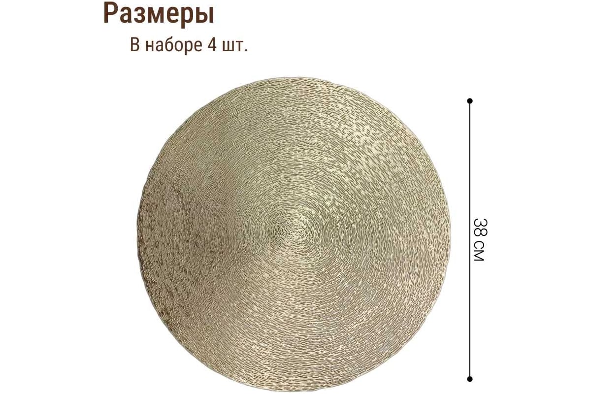 Плейсматы круглые помогут продемонстрировать внимание к деталям и хороший вкус перед Вашими гостями. Их необычная текстура и благородный золотистый цвет создают образ естественной элегантности и роскоши.