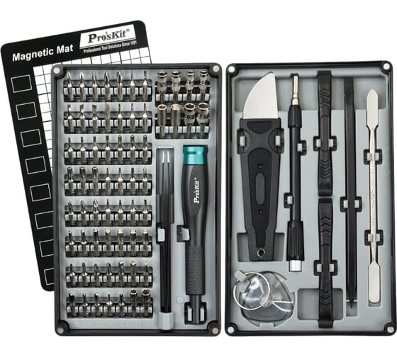 SD-9376M Pro'sKit набор(76 в 1)прецизионных инструментов для ремонта С00040395 Включает 76 инструментов: 64 прецизионных биты, инструменты для поддевания пластика и металла, инструмент для вскрытия экрана, прецизионный пинцет, магнитную подставку и многое другое — для удовлетворения широкого спектра ремонтных потребностей. Комплексный набор инструментов и продуманная конструкция для хранения, способствуют быстрой и эффективной ремонтной работе.