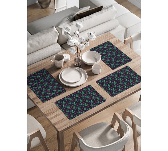 Сервировочные салфетки с закругленными краями размером 46х30 см – 4 шт. Набор салфеток прямоугольной формы из мягкого и приятного на ощупь высококачественного материала «Oxford» плотностью 200 гр./кв.м. Оксфорд – плотная ткань с водоотталкивающей пропиткой состоит из 100% полиэстера. Фактура ткани в виде «Рогожка» придает изделию однородную структуру и блеск. Салфетки на стол под тарелки станут украшением обеденного и даже праздничного новогоднего стола. Плейсматы- это современный декор и оригинальное решение для создания неповторимого стиля на вашей кухне, столовой, гостиной, а также в вашем доме или квартире. Благодаря современным технологиям нанесения сублимационной печати изделие отлично стирается, практически не мнется, рисунок не линяет, а материал устойчив к загрязнениям. Принт нанесен на изделие с одной стороны. Обратная сторона изделия -белая. Прямоугольные подложки на кухонный стол просты в уходе: изделие можно стирать при температуре 30-40 градусов, выбирая деликатный режим стирки и отжим не более 800 оборотов. Рекомендуем использовать мешок для стирки вещей в стиральной машине. НЕ ОТБЕЛИВАТЬ! Яркость рисунка может отличаться от изображения на сайте. Допустимо отклонение в размерах +-2 см.