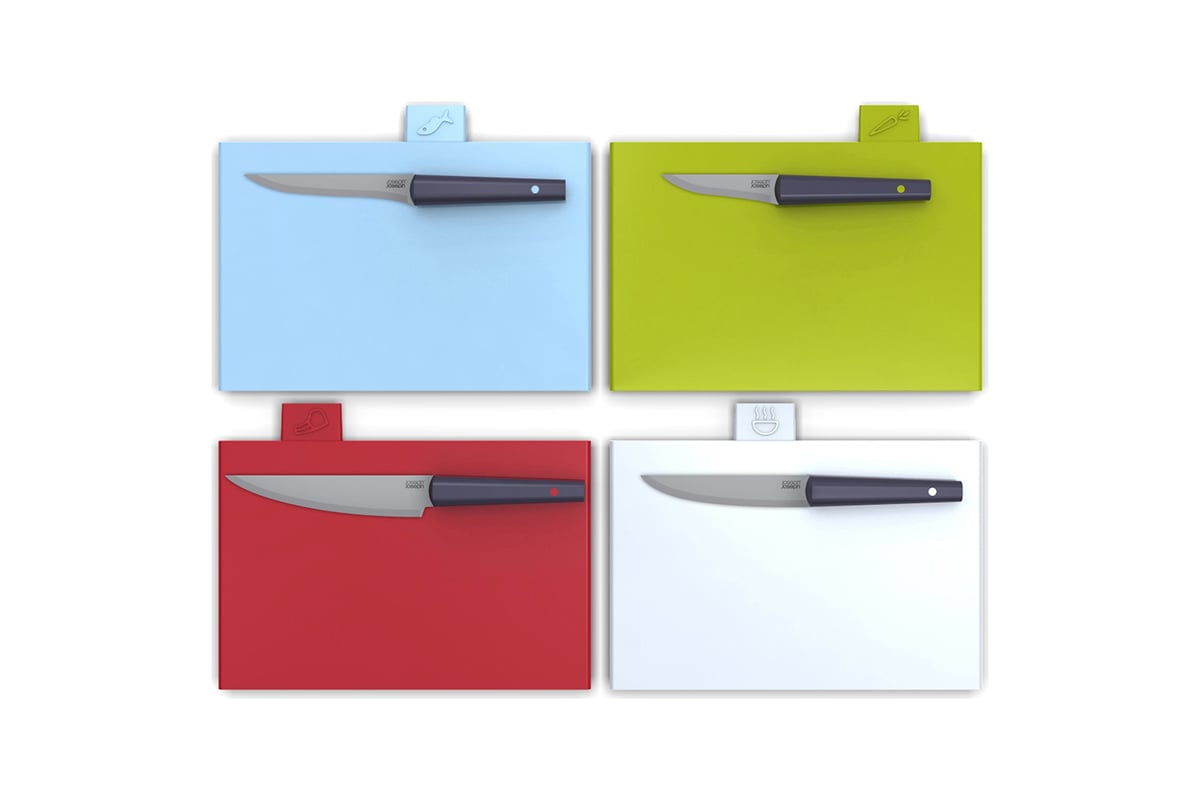 Специальные ярлыки помогают определить какую доску следует использовать для разных ингредиентов: сырого мяса, овощей, рыбы или же хлеба. Силиконовые ножки на досках препятствуют скольжению. Инновационное покрытие досок не дает ножам затупиться.