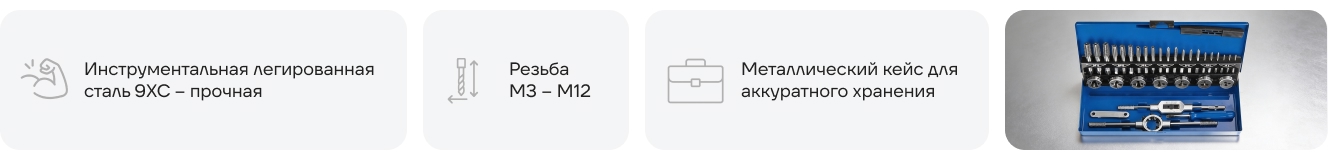 - 3 метчика М12 (черновой, получистовой, чистовой) с основным шагом 1,75 + плашка М12*1,75