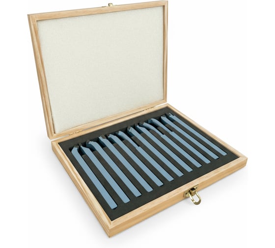 Набор резцов c твердосплавными напайками Т5К10 (державки 10х10мм) включает в себя 12 популярных видов резцов, которые помогут решить задачи любой сложности при обработке металла. Данный тип режущего инструмента относится к классу напайных резцов и предназначен для выполнения универсальных токарных работ по обработке стальных заготовок, включая черновое и получистовое точение, подрезку уступов и торцов, отрезку, продольное точение, расточку и нарезание резьбы.