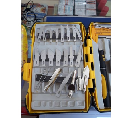 Магнитные держатели в коробке отвалились еще до того как я забрал заказ. Фигурные лезвия (нижний ряд - тупые от слова - совсем), пинцет не держится в коробке. "штангенциркуль" - отстой.