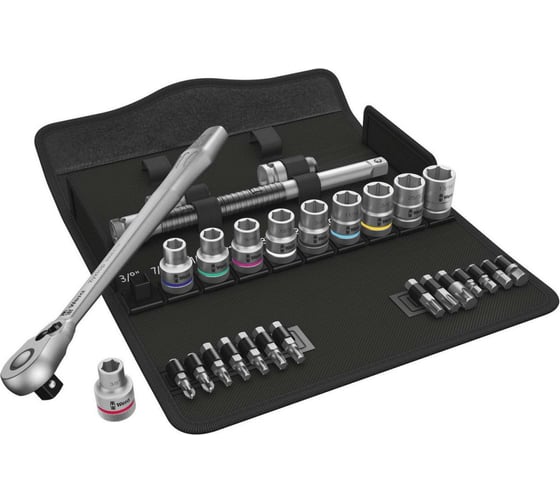 Набор с трещоткой WERA 8100 SC 11 Zyklop Metal Switch, с реверсом, DR 1/2", 28 предметов WE-004081используется для работ с крепежом при монтажных и демонтажных работах. Инструмент изготовлен из качественной стали, что обеспечивает прочность и долговечность. Обозначение инструмента Take it easy с цветовой кодировкой профиля и маркировкой размера обеспечивает быструю идентификацию инструмента. Компактное размещение большого числа инструментов обеспечивается благодаря мягкому футляру, обладающему высокой прочностью и долговечностью. Также футляр оснащен возможностью вертикального размещения для лучшего обзора инструментов на полке в мастерской.