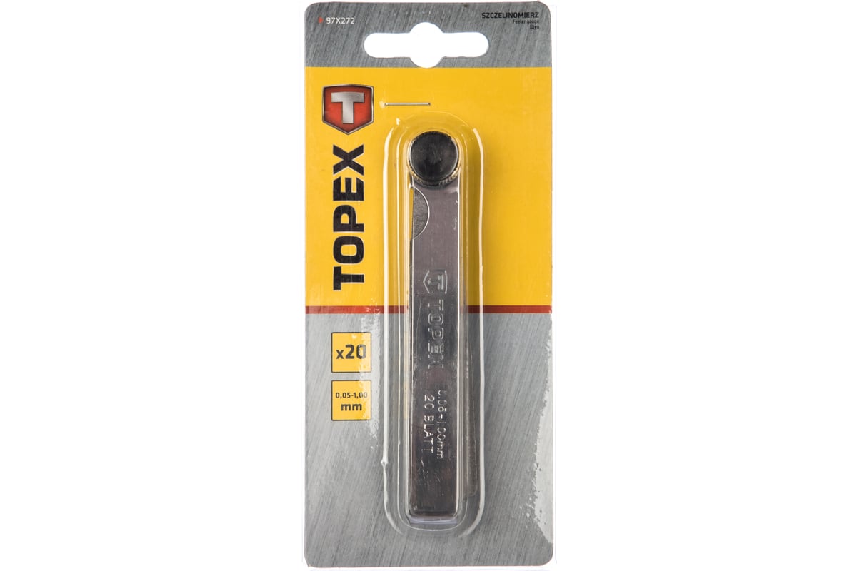 Набор щупов, 20 пластин TOPEX 97X272 применяется в автомастерских. Инструмент удобен в использовании за счет минимальной толщины щупа 0.05 мм. Это позволяет замерять зазоры клапанов и выполнять другие точные измерительные операции.