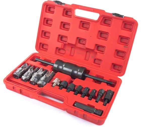 Специализированный набор на основе обратного молотка с комплектом из 14 адаптеров и захватов для безопасного и эффективного демонтажа «прикипевших» топливных форсунок Common Rail и других типов с головки блока цилиндров дизельных двигателей.