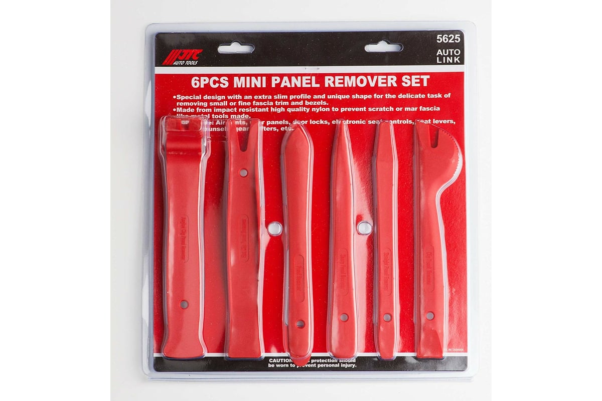 - Ультратонкая конструкция и уникальная форма набора съемников для демонтажа облицовочных панелей, 6 предметов JTC 5625 позволяет аккуратно открепить небольшие элементы приборной панели автомобиля;