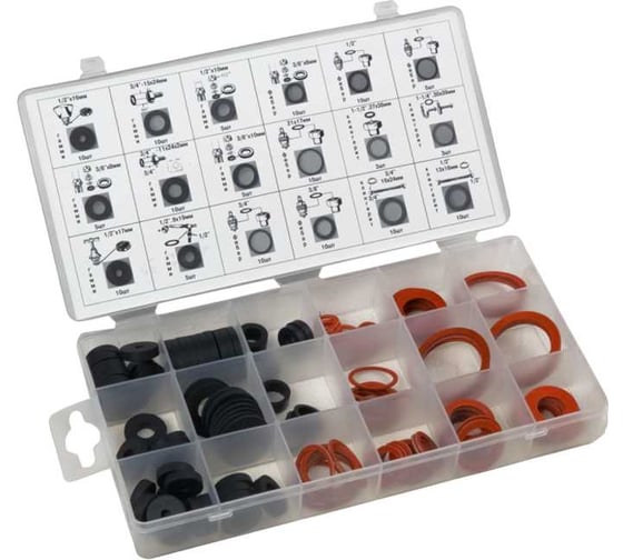Набор шайб-прокладок СЕРВИС КЛЮЧ состоит из 18 разных размеров, в количестве 141 предмет. Шайбы-прокладки используются для укрепления и герметизации болтовых соединений. Они найдут свое применение в автомобильной сфере, сантехнической и при других монтажных работ. Каждая шайба-прокладка изготовлена из качественной резины, что гарантирует выдерживание высоких нагрузок и герметичность. Каждый размер представлен в количестве от 3 до 10 штук. Благодаря этому, вы можете выбрать оптимальный размер для вашего проекта. Кроме того, набор поставляется в удобном кейсе для хранения и транспортировки.