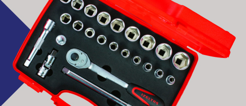 Набор шестигранных торцевых головок IZELTAS 24 предмета 1113002024 включает в себя трещотку, необходимые приспособления и широкий ассортимент головок. Скользящий вороток, шарнирный удлинитель и переходник существенно упрощают процесс выполнения крепежных работ в труднодоступных местах. Трещоточный ключ удобен в использовании, он имеет реверсивный переключатель и эргономичную накладку на ручке.