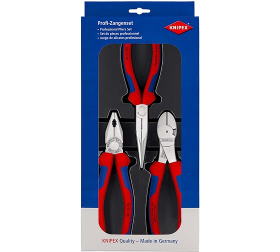 00 20 11 V01 Набор монтажный привлекательная упаковка для системы самообслуживания, с отверстием под крючок. инструменты в блоке из пластика глубокой штамповки с прозрачной крышкой. размеры (Ш х В х Г): 170 x 370 x 40 мм. С удобными трехкомпонентными рукоятками для улучшенного хвата и двумя интерфейсами KNIPEXtend для удлинителей. Комплект поставки: 1 x 03 05 180 KNIPEX Плоскогубцы комбинированные (180 mm), 1 x 26 15 200 KNIPEX Длинногубцы с режущими кромками (Длинногубцы с прямыми полукруглыми длинными губками, с режущей кромкой) (200 mm), 1 x 74 05 180 KNIPEX Бокорезы особой мощности (180 mm)