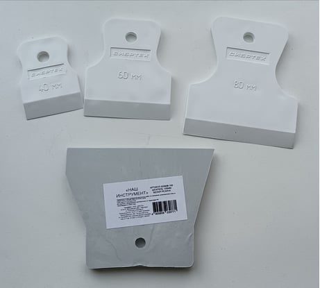 Приведу размеры шпателей из набора, может кому - то пригодится: 80*90*4,7мм; 60*72*4,7мм; 40*55*4,7мм. Скос на всех шпателях 11мм от рабочего края.