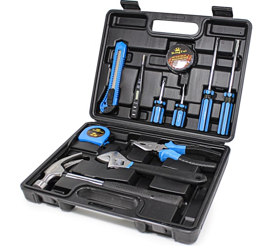 - Разнообразие инструментов - в комплект входят тестер напряжения, универсальный нож, изолента, отвертки различных размеров, рулетка, комбинированные плоскогубцы, регулируемый гаечный ключ, молоток-гвоздодер и удобный кейс для хранения, что обеспечивает универсальность использования набора.