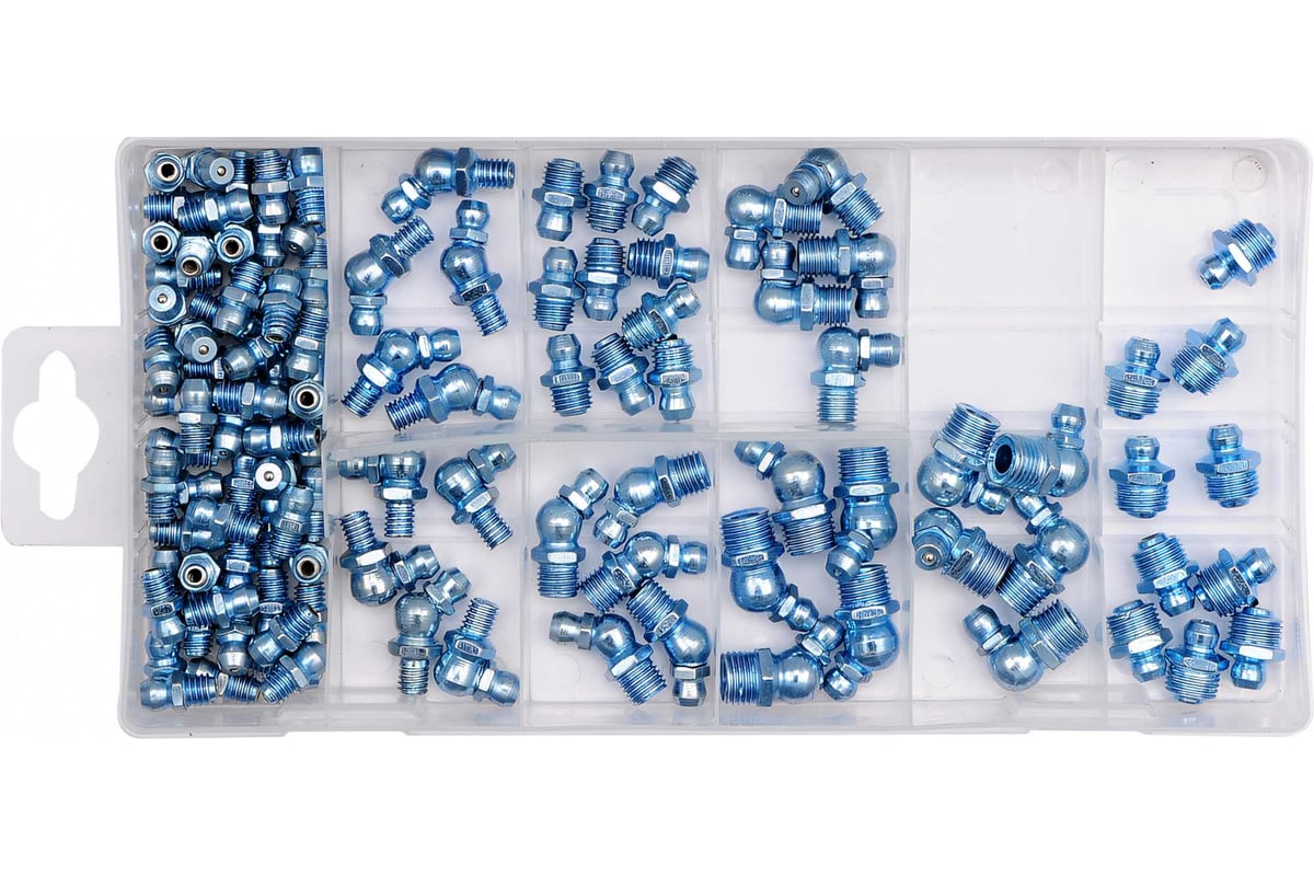 Набор смазочных нипелей YATO 110 шт. YT-06888 упакован в удобный органайзер. Резьба метрической резки. Незаменим в автомобилестроении, сельском хозяйстве и промышленности.
