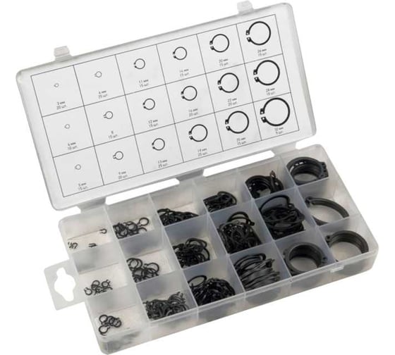 Набор стопорных колец СЕРВИС КЛЮЧ– удобный комплект из 300 стопорных колец различных размеров (от 3 мм до 32 мм). Используются для различных держателей и креплений, которые используются в разных областях – автомобильная промышленность, строительство и другие.