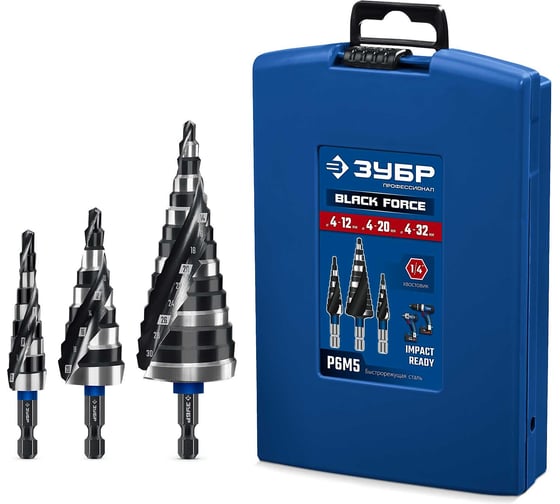 Набор ступенчатых сверл Зубр Профессионал BLACK FORCE 3 шт., 4-32мм, винтовая проточка 29671-4-32-H3
