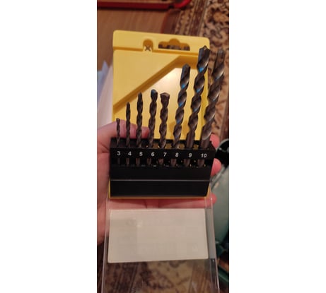 В наборе 8 сверл следующих диаметров: 3 мм; 4 мм; 5 мм; 6 мм; 7мм; 8 мм; 9 мм; 10 мм.