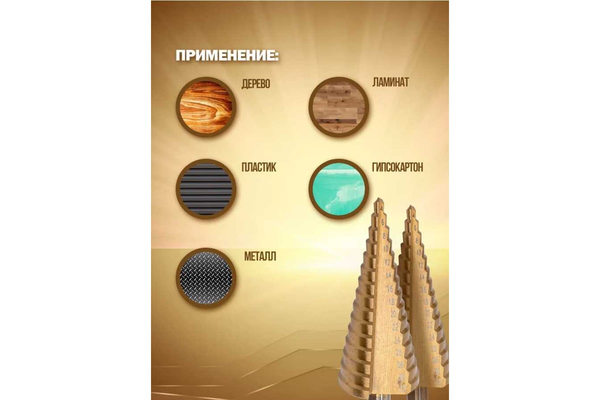 Принцип работы конусного сверла прост: каждый следующий размер имеет плавный переход в виде ступеньки, что позволяет получать аккуратное отверстие нужного диаметра, не меняя при этом насадки. На каждой ступени есть маркировка фактического диаметра. Отверстие центрирует идеально.