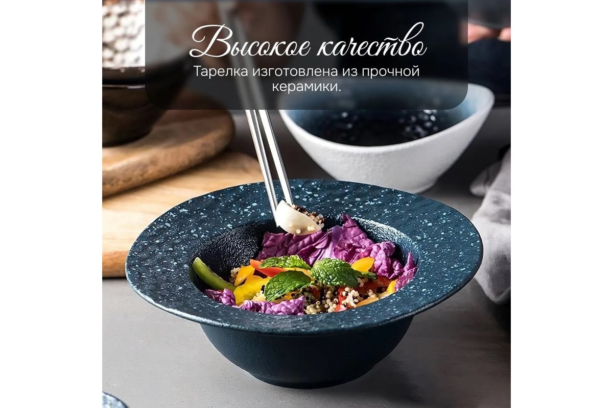 Тарелка для супа из керамики очаровывает благородным темно-синим цветом, который придает посуде особый шарм и притягательность. Благодаря такому стилистическому решению глубокая суповая тарелка с легкостью станет центром внимания на застолье, создавая неповторимую симфонию оттенков, от глубоких и насыщенных до нежных и полупрозрачных.