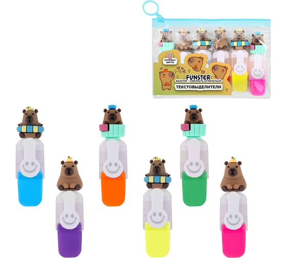 Набор текстовыделителей с топперами 6 ЦВЕТОВ НЕОН FUNSTER, КАПИБАРЫ, линия 1-4мм, 152646